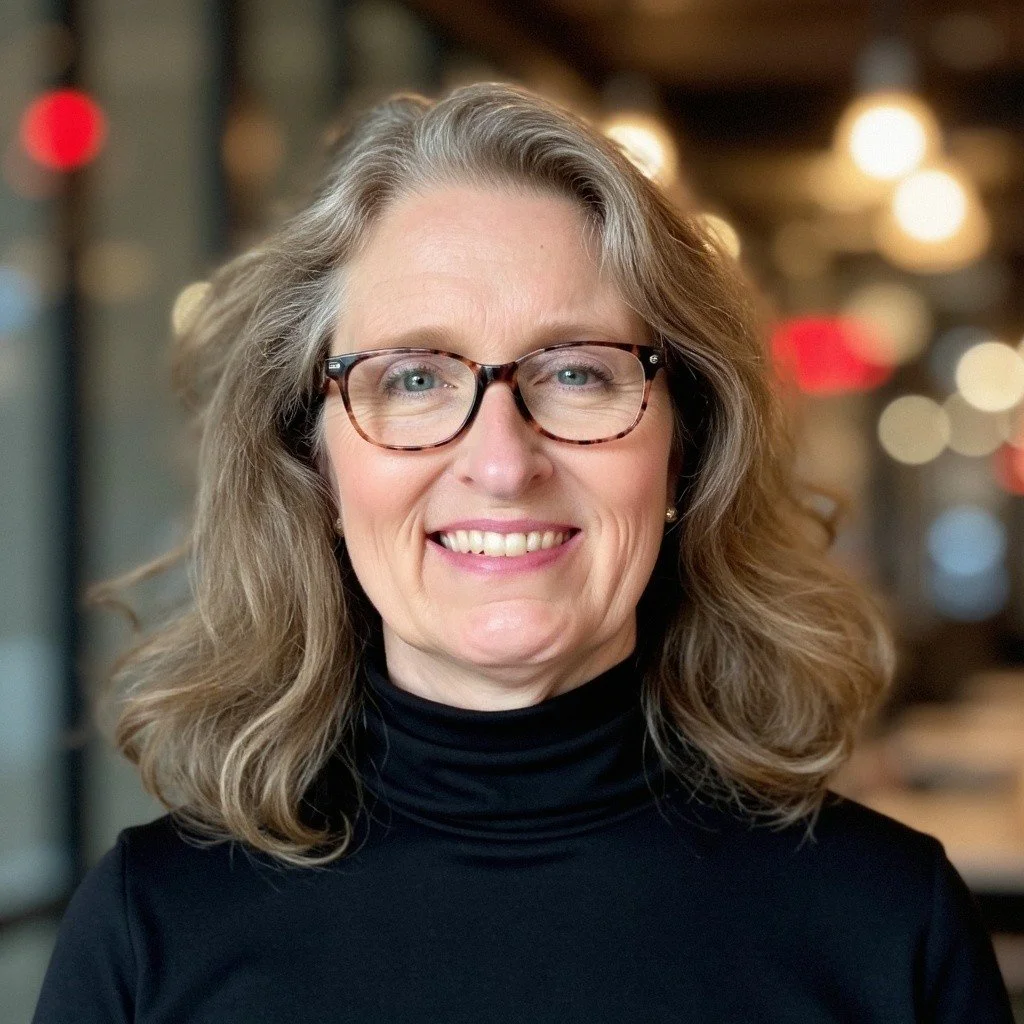A middle-aged woman with wavy, shoulder-length blonde hair and glasses, smiling at the camera in an indoor setting with blurred lights in the background.